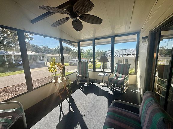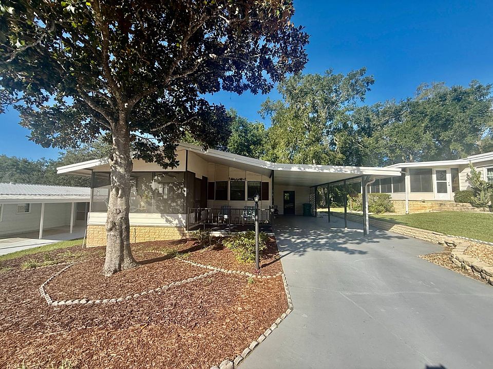 Home is located in Water Oak Country Club Estates in Lady Lake Florida, an active 55 plus resort style land lease community. Bright, open and cheerful home! Located near the main front gate, main clubhouse and amenities, as well as the golf course and restaurant. Enjoy resort style Florida living, without breaking the bank! Spacious driveway and carport as well as a separate golf cart driveway for easy access. Large utility shed, also houses the washer and dryer which convey with the home. Covered front patio is a great spot to enjoy to enjoy your morning coffee. The screened in lanai is a great spot to relax or entertain. Custom etched glass wood entry door is very inviting. Interior has been freshly painted. All kitchen appliances convey as well. Seated island makes meal prep a breeze, or provides extra seating for guests. Nice dining area opens up to the comfortable living room. Sliding glass doors access the front lanai. Guest bedroom has a spacious closet and a full guest bathroom across the hall, with tub/shower combo. The large primary bedroom has a large walk in closet and the en suite bath has a walk in shower. AC/Heat pump was replaced in 2014 and a metal roof was installed in 2015, will provide piece of mind for many years! This one will not last for long! Water Oak is a premier active 55+ land lease community in Central Florida. A peaceful community with rolling hills, historic trees, and a newly renovated 18-hole championship golf course. Enjoy a gated community that mows your lawn as you live a resort lifestyle with two beautiful clubhouses, heated pools, a sports center, a restaurant, and a variety of clubs and activities. Call to see this home today!