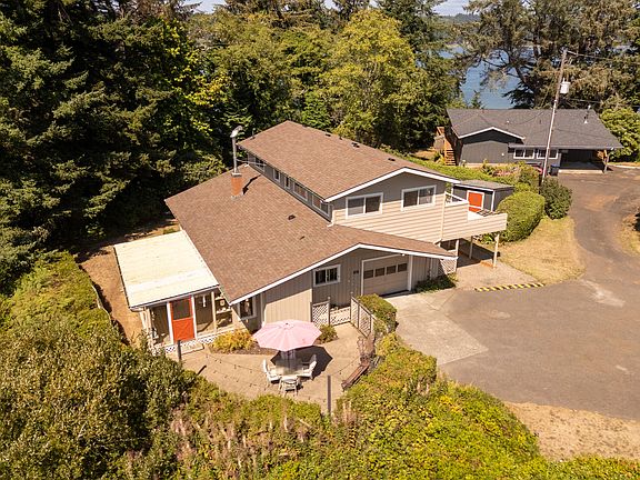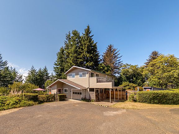 Perched atop Waldport Heights on nearly an acre, this beautifully updated home offers privacy and room for expansion. With 2 bedrooms and a full bath downstairs, plus 2 bedrooms and 1 bath upstairs, a large sunroom, and a brick-and-mortar fireplace. Beautiful mudroom entryway is perfect for the wet seasons. For added convenience, the attached garage opens directly to both a modern kitchen with granite countertops with ss- appliances, & main downstairs hallway. Enjoy fresh exterior paint, Trex decking, concrete porch, an additional storage shed, and carport. Fully finished ''Driftwood Studio'' is a great space for any hobbyist. Exceptional landscaping. Lush greenery throughout, with hidden pathways and trai