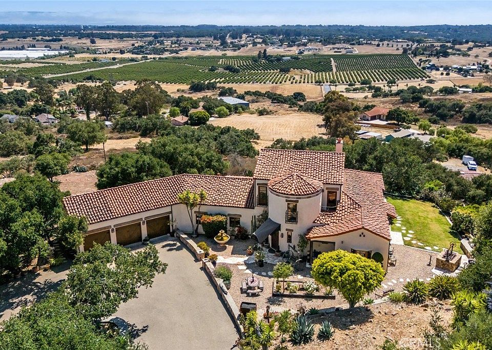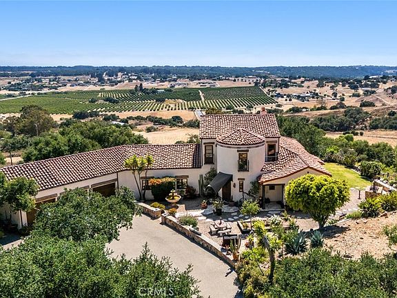 Beyond a private gated entrance, this extraordinary estate unfolds across 10.19 acres studded with avocado trees in the coveted Nipomo East region. Evoking the soul of California's rancho heritage, the property blends Spanish revival architecture with equestrian elegance, offering an exceptional retreat defined by craftsmanship and timeless design. As you pass a classic barn and pastures with welded oil pipe fencing, the estate reveals itself through a graceful circular drive—leading to an attached three-car garage and additional space thoughtfully designed for RV accommodation. A flagstone and brick walkway leads you to an impressive 8 foot mesquite and copper front door and custom copper canopy, setting the tone for the residence within. Spanish tile floors, soaring beamed ceilings, and meticulous copper and ironwork welcome you into a space where artistry meets serenity. The main living area, anchored by a statement fireplace, invites intimate gatherings or quiet moments of reflection. Adjacent, the kitchen balances vintage charm and modern function, featuring bar seating, a generous island, full pantry, wine cellar with antique doors, and a striking vintage Elmira stove and oven—a true homage to tradition. Flowing seamlessly from the dining room, the backyard unfolds into a lush landscape with a signature Santa Maria-style BBQ and native plantings, designed for both celebration and repose. A sunroom offers a refined escape for year-round entertaining, with a fireplace for crisp mornings and double doors opening to breathtaking panoramas stretching to the distant Pacific. The primary suite on the main level exudes tranquility, complete with its own hearth, private sitting area, two walk-in closets, soaking tub, dual vanities, and walk-in shower—every element curated with care and artistry. Upstairs, a cozy landing leads to two additional bedrooms, a shared bath with dual access, and a private balcony where sunsets spill over the valley and ocean beyond. A rare offering where architectural integrity meets expansive natural beauty, this estate is more than a residence—it is a refined way of life.