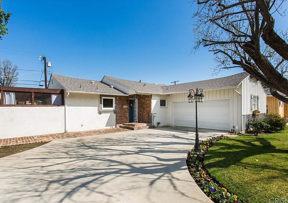 Welcome to South Reseda's finest neighborhood. This lovely home is located on a quiet tree-lined street. A large concrete driveway with lanterns leads you to the brick front porch. Enter this warm and inviting home through the new front door. The interior boasts of wood floors, recessed lights, energy efficient windows and custom window treatments. The 3 spacious bedrooms have large closets. 1.5 baths include double sinks in the main bathroom. A remodeled kitchen includes granite counters and a glass tile back splash. Built in appliances and a utility island are also featured. The oversized living room allows for comfortable gatherings and includes built in cabinetry and shelving and a separate dining space. French doors lead to the side yard cabana. The cabana has walls of curtains allowing for complete privacy, or leave them wide open for the full outdoor entertaining experience. A fan light is part of the cabana. The back yard fencing is taller than average for additional privacy. A stone patio is highlighted with a beautiful stack stone tile water feature and a gas fireplace. Lovely landscaping all around the home add to the charming curb appeal. Additional features include; automatic sprinklers, a roll up garage door for the 2 car garage, washer/dryer hookups inside the garage, alarm system and a new roof.