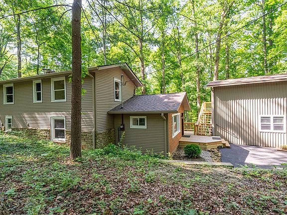 Welcome to this beautifully renovated 3-bedroom, 2-bathroom home, nestled on 3.92 acres of serene wooded land, just minutes from Bloomington's East Side and Lake Monroe. This two-story gem combines vintage charm with modern updates, offering the perfect retreat for both tranquility and convenience. Step inside to discover an open floor plan that seamlessly integrates the living spaces while preserving many original features. The stunning Brown County stone fireplace serves as a focal point, while custom built window seats and stained- glass work add character throughout. The completely new kitchen features granite countertops, a breakfast bar, and high-quality finishes, making it a chef’s dream. Enjoy new bathrooms and plumbing, completely new electrical, and engineered hardwood hickory flooring, cedar-lined closets, and clean air thanks to new insulation, drywall, and subfloors. The sunroom provides a peaceful spot to soak in the beautiful wooded views. Recent upgrades include a new roof, gutters, HVAC system, and a new water heater, ensuring peace of mind for years to come. Outside, the new wrap-around deck invites you to relax and take in the surroundings, while the separate workshop and studio offer versatile spaces for hobbies or work. The property boasts a large parking area with an open carport and a convenient gravel turnaround near the street. With white oaks, beech, and pine, this quiet setting is still just a short drive from shopping, Indiana University campus, and the local hospital. Don’t miss the opportunity to own this unique and move-in ready blend of history and modern living—schedule your showing today!