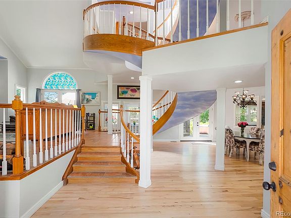 Your castle awaits on an expansive 2.8 acres of serene woodlands, perfect for entertaining, relaxation, or multigenerational living. This property with mountain views is designed for comfort and indulgence. Upon entry, you are greeted by a dramatic staircase with a skylight, authentic hickory wood floors, and a large, open great room that includes a dining area, sunroom, and gourmet kitchen. Ascend to the upper level to find a spacious secondary bedroom, a loft, and a bathroom, along with an oval-shaped library where the ambiance and views will inspire your imagination. At the very top level is the primary bedroom with a newly remodeled five-piece ensuite, a walk-in closet, and a private balcony. Nearby is a treehouse-like bedroom that can double as an office. The walk-out basement offers generous space, easily convertible into an apartment, office, or gym. The property is not just beautiful but also practical—low taxes and HOA fees make it a great value. Recent updates include a hail-resistant roof and gutter system, new interior and exterior paint, a newer HVAC system, a well pump, an asphalt driveway, new water heater and a sprinkler system. All that's left to do is move in and enjoy the tranquility of nature combined with luxurious living. The treed 2.8 acres can be enjoyed from the hot tub, back patio, or on horseback. The property includes a well permit that supports horses and backs up to community bridle paths, complete with a community outdoor arena. With a perfect blend of luxury, comfort, and outdoor living, this stunning retreat could be your dream home. Schedule a private tour and experience the magic of this Hidden Village gem.