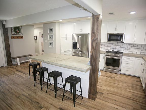 Open kitchen living room concept Completely updated throughout. Kitchen features concrete counter tops, custom wood cabinets with lots of pull out drawers adding a designer touch. The oven has a one rack drawer under the large section that can be used as a second oven or warmer. Master bedroom includes a large walk-in closet with barn door. The master bath has custom tile shower with two shower heads. Split bedroom plan with 3 bedrooms and 1 bath on one side of the house. Covered patio includes a fire bowl fueled by propane. Lot is 60 x 234