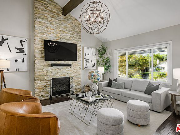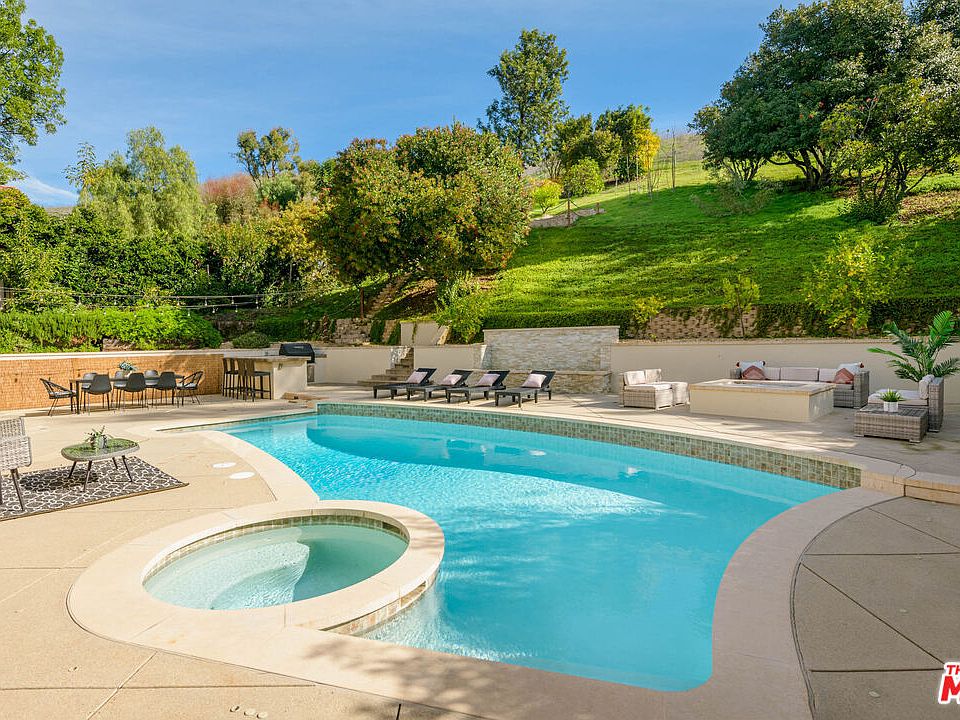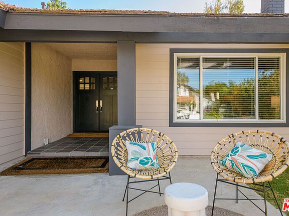Nestled in the picturesque Oak Park community, this warm and welcoming home offers one of the most impressive backyards in the neighborhood. Set on a peaceful, tucked-away street, the property features over 2,200 square feet of thoughtfully designed living space, including four bedrooms and three bathrooms. The double-door entryway opens to a grand foyer and spacious living room, highlighted by vaulted ceilings and a stack-stone fireplace. The formal dining area features French doors that lead directly to the resort-style backyard, creating a seamless flow for indoor-outdoor living. The open-concept kitchen flows into the great room, where a second set of French doors opens to the pool, creating an ideal layout for everyday comfort and entertaining. The first floor includes a well-appointed guest bedroom and full bathroom, while upstairs you'll find two additional guest bedrooms connected by a Jack-and-Jill bathroom. The second-floor south wing comprises only a primary suite and overlooks the idyllic backyard. The secluded backyard is the true showstopper, a resort-inspired oasis designed for year-round California living. Enjoy a sparkling pool and spa, a tranquil water feature, a built-in fire pit lounge, and a fully equipped outdoor kitchen complete with barbecue and refrigerator. Beyond the home itself, residents can take full advantage of Oak Park's natural beauty and peaceful atmosphere, with access to scenic hiking trails, neighborhood parks and award-winning schools, and the lush, picturesque landscapes the community is beloved for.
