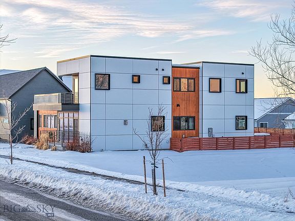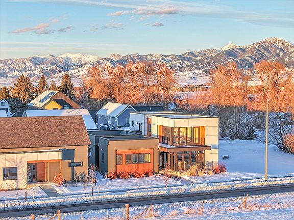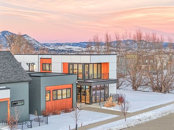 This architectural beauty , designed by Studio H Designs, is a modern sanctuary that blends thoughtful craftsmanship with contemporary sophistication. Every detail of this home has been carefully considered to highlight its unique design, and its stunning South Bozeman location allows for uninterrupted views and breathtaking sunsets. Floor-to-ceiling high-efficiency Innotech windows invite an abundance of natural light, bathing the open main level in sunlight and framing panoramic views that stretch for miles.The sleek, minimalist kitchen is a work of art, featuring honed marble waterfall countertops, a blend of walnut and matte-black high-end cabinetry, double Fulgor Milano wall ovens, an oversized centerpiece island, and a functional pantry. The main level also includes a spacious en suite bedroom and a versatile den/office area, offering flexible living options. The second floor is dedicated to the sun-bathed primary suite, where the mountain views take center stage and floor-to-ceiling windows bring the outdoors in. The primary has two separate closets and a spa-inspired master bath with marble tile. Two additional guest rooms and a well designed guest bathroom, also featuring marble finishes, complete the upper level. To ensure year-round comfort, the home is equipped with two-zone heating and cooling. This home has an expansive rooftop deck and newly designed backyard landscape that includes water-saving turf and contemporary design.