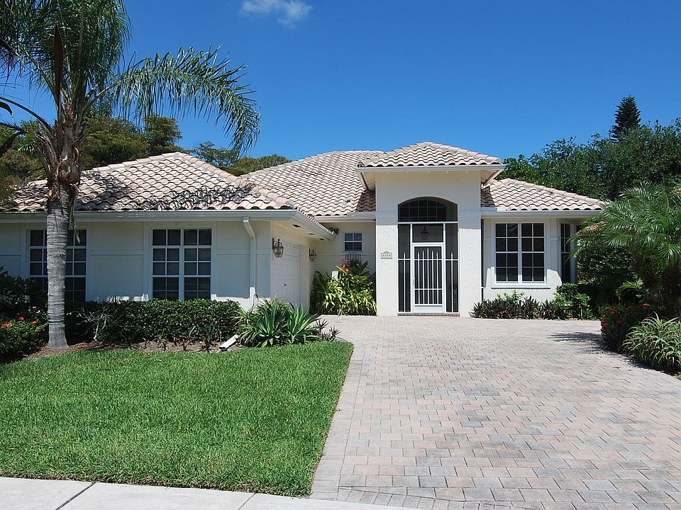 Wonderful open ''Great Room'' plan, 2 bedrooms, 2 bath w/double door entry to home office/den. High ceiling, decorator niches, ceramic tile. Kitchen offers center island, built-in desk, solid wood cabinetry & appliances & charming breakfast area w/wrap-around windows overlooking screened in patio, orchids & gardens. Double door entry to master featuring lrg His & Her walk-in closets. Master bath features deep spa tub, lrg walk-in shower, cable & phone, private water closet w/bidet.Large laundry w/additional storage & utility sink. Over-size 2 car garage w/ storage area & work bench. Screened front porch entry. Side entry garage. All lawn maintenance, Htd Pool, Whirlpool, Tennis, Fitness Center, Cable, Security Monitoring, & Gated Entry incld in Monthly Maint. $250. Brokered And Advertised By: Lang Realty/WPB Listing Agent: Mary M.Peg Delp