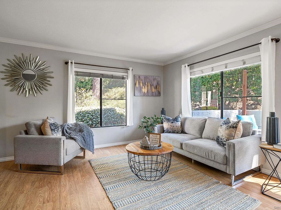 Discover this secluded townhouse in the North Rim community of Linda Vista. This private corner unit features 3 outdoor spaces, offering serene views of the surrounding area. The living area includes a cozy fireplace and tons of light, the kitchen has been updated with quartz countertops. Primary bedroom has vaulted ceilings and a private balcony. The attached two-car garage provides ample storage and includes a full-size washer & dryer. This community offers a variety of amenities, including a pool, spa, sauna, tennis courts, pickleball courts. Conveniently located near USD, Fashion Valley Mall, and San Diego's beautiful beaches.