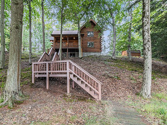 This stunning furnished full-log home offers the perfect balance of rustic charm and modern comfort, set on almost 2 acres with 147 feet of natural Hamlin Lake frontage. Two docks and a boat lift make it easy to enjoy endless days on the water, while the covered front porch invites you to relax, watch wildlife, and take in breathtaking sunsets.Inside, the open floor plan features a spacious kitchen, dining area, and living room with soaring cathedral ceilings. The main floor includes a primary suite with full bath and convenient laundry. Upstairs, the loft provides a cozy sitting area or extra sleeping space, along with a bedroom and full bath featuring a jetted tub.The finished walkout lower level adds even more living space with a family room, bonus sleeping area, full bath, and workshop—complete with direct access to the patio and waterfront. Outside, you'll find a shed plus a storage building with electricity, giving you plenty of space for tools, lake gear, and hobbies.