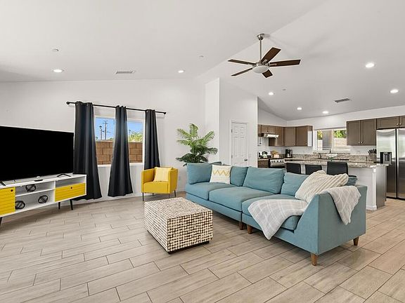 Enjoy Spacious Open Floorplan Living at Its Very Best! Take advantage of the Owned Solar in this 2022-built, energy-efficient home to keep your utility costs low. Upon entering, you'll love the grand vaulted ceilings in this highly upgraded 4-bedroom, 2-bathroom home. Kitchen features include upgraded cabinetry with designer granite countertops--an ideal space for entertaining family and hosting social gatherings. Tile flooring runs throughout the main living areas, carpet flooring in the bedrooms, and the modernized, highly upgraded bathrooms add a luxurious touch. The list of upgrades goes on and on! Enjoy expansive views of the San Jacinto Mountains from your living room, and complete privacy within your fully walled backyard. Located just two blocks from Miracle Springs Resort & Spa. You've got to see this home!