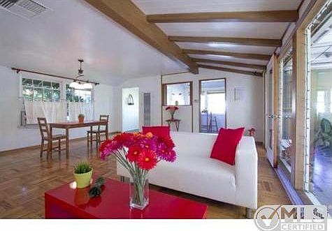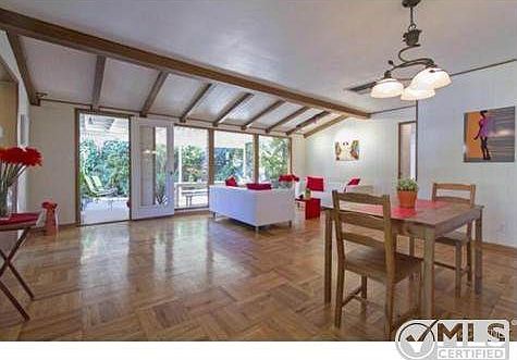 Wow! This Mid-Century Modern jewel just sparkles. Located in a terrific Valley Glen location, it combines classic California curb with simple and bright interiors. Moving forward, a drought-tolerant yard leads to a covered porch. Here you enter a small slate-floored vestibule, then on to a parquet-floored open space that combines living room and dining room; flanked on one side by a wall of glass and the other with paned windows, flooding the interior with natural light. The eat-in kitchen has vintage tile and modern amenity, a large pass-through opening to the living area and access to the garage. To the rear of the home are three ample bedrooms and a hall bath. The backyard is huge and is split into three distinctive spaces. Off the living room, the flow continues to a covered patio that is encircled with beautiful plantings, a fountain and towering palm trees. It has the feel of a great atrium, designed perfectly for outdoor dining. A rear bedroom opens to a second covered patio, and then on to a vegetable garden and a large grassy area centered with another patio, intended as an outdoor living room. It is a simple creed; bring the outdoors in, and the hammering, honking world will fall away. This is a home to live that life.