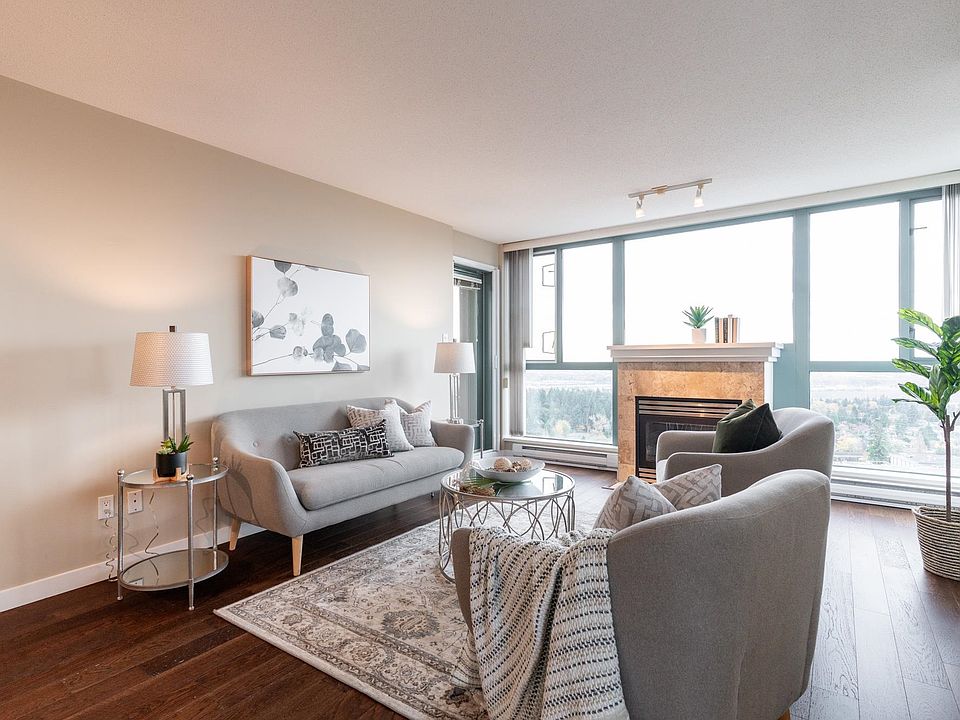 Views Galore!! Welcome home to this bright and spacious 2BDR + Den/Family Room SW CORNER suite at Gemini II by Bosa. Offering 1160sf of open living space. Newer hardwood floors and bedroom carpet, cozy gas fireplace & large covered balcony that has unobstructed views to the water, Vancouver Island, city and mountains. Insuite laundry and a relaxing ensuite with soaker tub. Includes 2 parking stalls and 1 storage locker. Pets welcome (2 dogs/2 cats or 1 dog & 1 cat). This well-cared-for building features a gym, multi-purpose room, sauna/steam room, social-lounge and bike storage. Located just steps from the tennis courts, Highgate Village shopping, trails, parks, schools and transit. This is a rare opportunity to own a stunning home in an unbeatable location! Call to view.