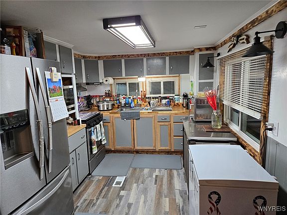 Welcome to 666 B Street, a charming double-wide, manufactured home, nestled in a quiet neighborhood outside of Niagara Falls. Offering extra space, the large living room and open concept makes this a perfect place to call home. The 3rd bedroom can be added back in if more space is needed, but this property is move in ready. Live worry free with recent updates, including, Windows (2020), porch/railings, plumbing, water lines, flooring, roof, and bathroom (all 2024). This property includes an extra large lot and a shed for your extra storage needs. Located near local amenities, shopping, and major roadways for easy commuting. A great opportunity for affordable homeownership! Value Range Pricing, Seller is considering offers between $35,000 and $45,000. SELLER FINANCING AVAILABLE!