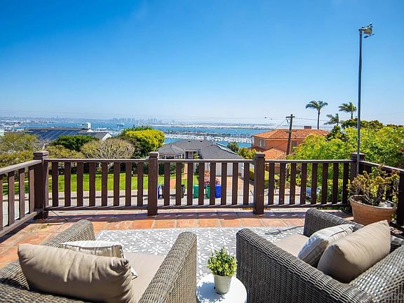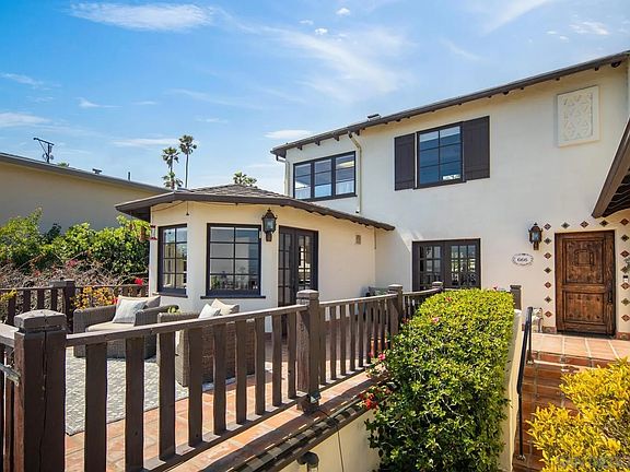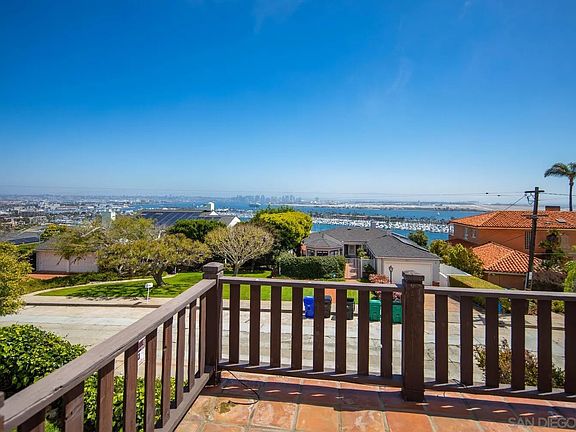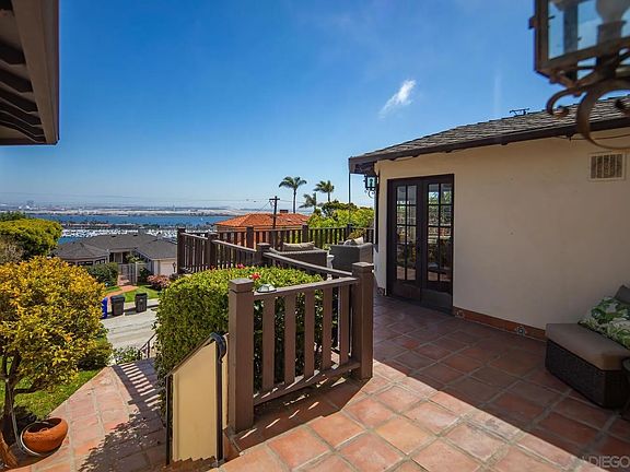 Spanish charmer located in the heart of La Playa. Sweeping city, ocean & bay views. Spacious light & bright kitchen, with breakfast nook enjoying the views. Formal living & dining rooms plus a library/office with built in bookcases, perfect for an in home office or optional 3rd bedroom. Large detached guest house with built-in bar, fireplace and full bath. Terrific view deck off kitchen & dining room, perfect for entertaining. Enjoy relaxing on the back patio with a lovely Spanish fountain. Then enter the garden where there is an in ground jacuzzi. The garage has two large storage rooms and a walk-in, climate controlled, wine cellar. A property not to be missed. The main home is 1800 sq. ft. and the guest house is 450 sq. ft.