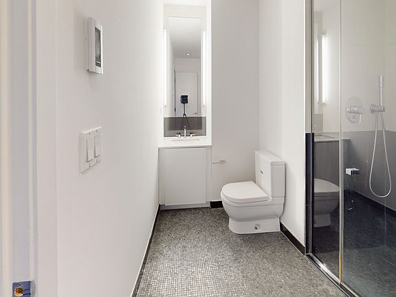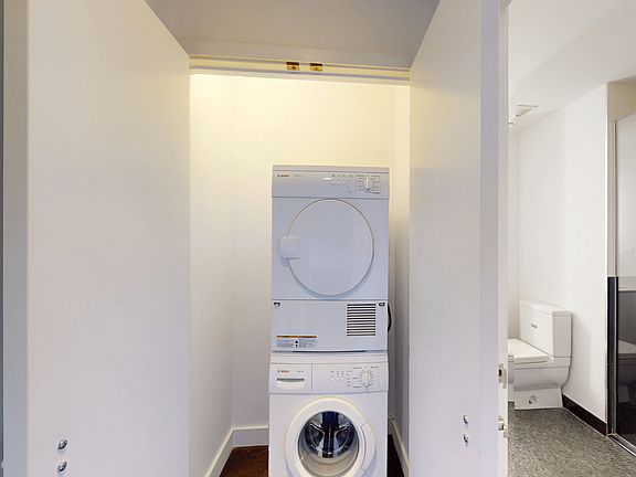 This beautifully appointed 1-bedroom, 1-bathroom residence features a sleek, contemporary kitchen with quartz countertops and backsplash, a state-of-the-art Liebherr refrigerator, and a built-in Smeg dishwasher. The spa-like bathroom is outfitted with Duravit fixtures, a GD Cucine vanity, and heated mosaic tile floors. Additional highlights include in-unit washer/dryer, oversized closets, wide-plank oak flooring, and double-paned, energy-efficient windows with electronic shades.