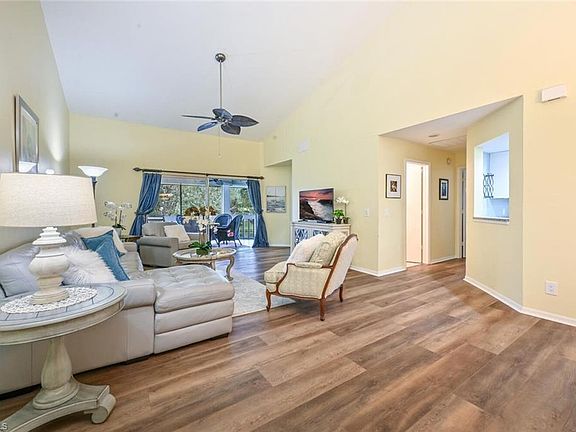 AVAILABLE NOW FOR ANNUAL LEASE. GREAT LOCATION! PERCHED ON THE SECOND FLOOR THIS OPEN AIRY SPACIOUS LAKEFRONT CONDO FEELS SO GOOD THE MOMENT YOU WALK IN. THE VIEWS AND BREEZES IMMEDIATELY WIN YOU OVER. Unique setting overlooking a beautiful lake. 1 mile to Delnor-Wiggins Pass State Park Beach. The"Great Room" open floor plan flows with ease and offers privacy for you and guest. Main bedroom with huge bath, walk-in closet, double vanity, tub and shower. Second bedroom also with lake view and full bath. Rich luxury vinyl plank floors throughout, high vaulted ceilings, and sleek kitchen with white wood cabinets contrasted with granite counters. Enjoy cross breezes and relax on lanai over looking the lake and morning sunrise. Community room and pool. Extra storage and covered (Carport) parking space included. FULLY FURNISHED.