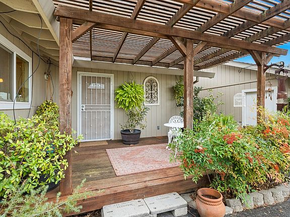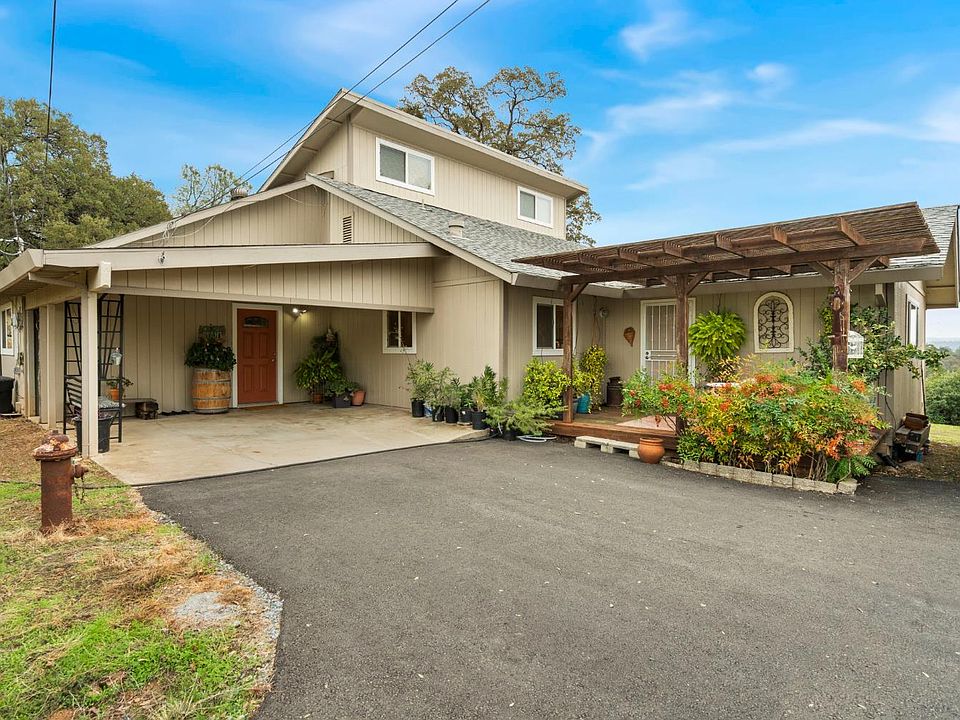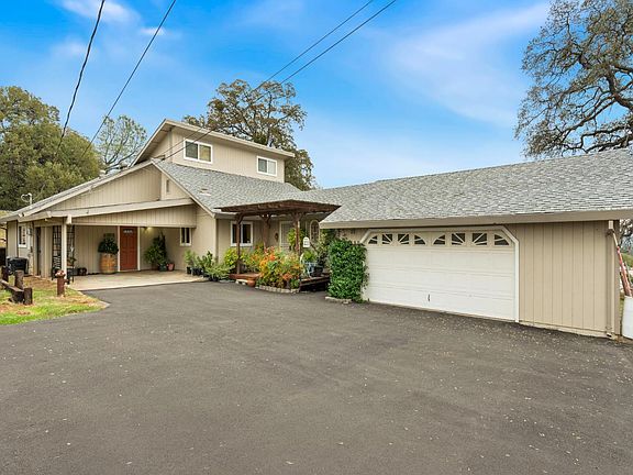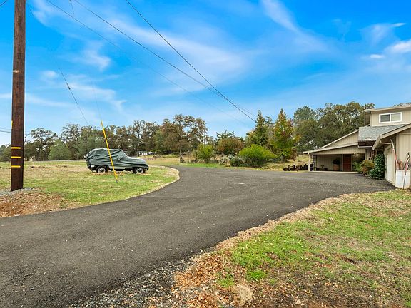 Charming Rural Country Retreat, corner of quiet roads, 3 tree shaded acres with natural rock outcroppings, fruit trees and garden beds, with expansive deck offering tranquil natural beauty with breathtaking sweeping panoramic, forever, peaceful, pastoral views to the Sierras. Perfect blend of rustic charm with modern convenience. Upgraded Kitchen features granite counters, stainless steel appliances and sink, breakfast bar, and overlooks formal dining room with volume natural cedar ceiling and gathering room with warm pellet stove in brick surround. Primary Ensuite bedroom with updated bath and flex bedroom are main level. Flex bedroom can be office, guest suite or hobby room, with additional attic storage access. Upstairs, additional bedroom and full bath and open Loft. It's also fire hardened, suitable for Equestrians, has two sheds and oversized 2&1/2 car garage, covered carport and RV access. At over 2100 sq ft, motivated Seller has priced this totally beautiful move-in ready home well under market. Please Compare with all other comparable homes on the market!