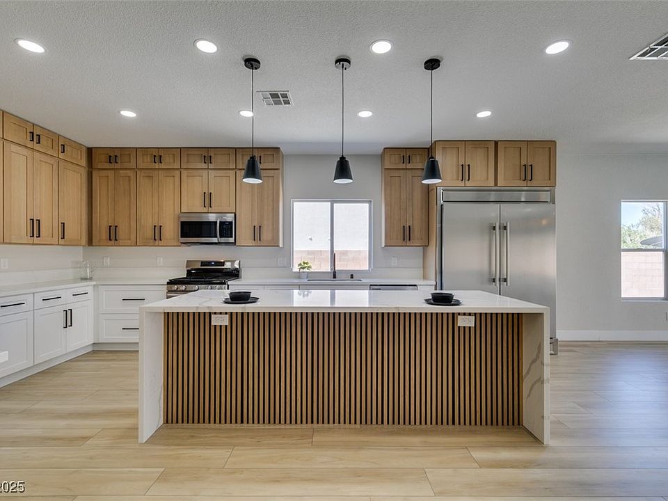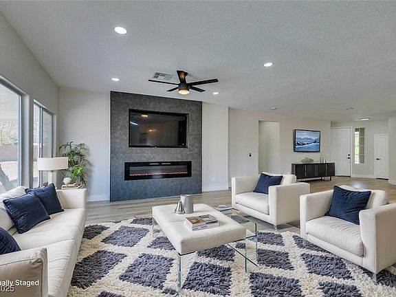 Stunning fully renovated single story home located on a premium corner lot in a quiet cul-de-sac, featuring a 3 car garage, gated RV parking, and a sparkling pool. This home offers a grand chef’s kitchen with two toned shaker cabinets, quartz countertops, a waterfall island, built-in refrigerator, wine fridge, and a bold statement fireplace with a mounted 65" TV. Enjoy breathtaking mountain views, warm luxury vinyl plank flooring that’s perfect for poolside living, and an open modern layout ideal for entertaining. The spacious primary suite boasts a luxurious bathroom with a standalone soaking tub and separate walk in shower, while a second primary suite with its own private entrance offers flexibility for guests, extended family, or rental potential. This home truly has it all, style, function, and unbeatable location.