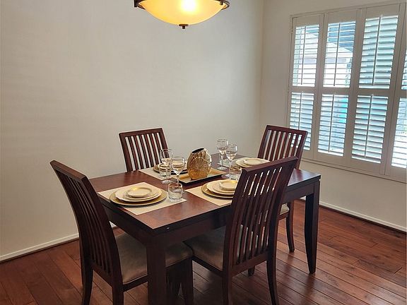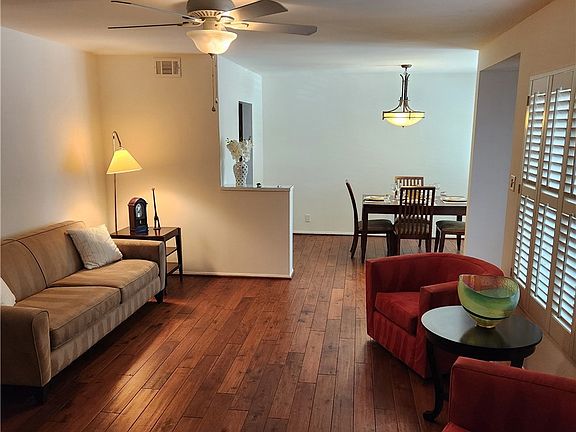 Move in condition! Entire interior just painted and professionally cleaned. Be sure not to miss a great opportunity to make this your own. Many quality upgrades through out this home. Assessor has a 3 bedroom 2 bath and can easily be a three bedroom again by placing closets in the family room.  Plantation shutters in Living room, dining, large bathroom, both bedrooms and family room. Wood floors in the entire home except kitchen and baths which have tile floors. Spacious kitchen with pull out shelves, 2 ovens, 2 pantries with pull out shelves, desk area and stainless refrigerator. Ceiling fans in Living room, family room, both bedrooms. Bedroom has large walk-in closet with shelves and rods. Second bedroom has mirrored closet doors and shelves in closet. Large bathroom has soaking tub. Ready to move into this beautiful home that has sliding doors from family room to a large covered patio overlooking an inviting green lawn. Garage has built in storage, shelves, work area with drawers a tall freezer included in the sale. A wonderful surprise to this property SOLAR.