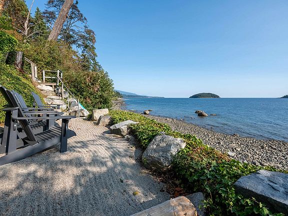 The perfect vacation cottage—stylish, spacious, and beautifully maintained—set on the waterfront with unparalleled views of the Trail Islands and Strait of Georgia. Enjoy year-round sunsets from the expansive front deck or relax in the private hot tub. Thoughtful updates include new flooring, septic system, fenced yard, new heat pump, improved beach access leading to a large private viewing platform, perfect for entertaining, soaking up the sun, and embracing the coastal lifestyle. A detached bunky offers extra guest space, ideal for family or friends. Across the highway, the hooked parcel features 35,500 sqft of gently sloping treed property with subdivision potential, providing an opportunity to build a second home. A rare legacy property offering both charm and future opportunities.
