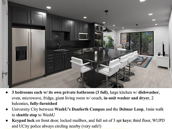 3-bedroom, 3-bathroom, fully-furnished, located in University City between WashU's Danforth Campus and Delmar Loop. Rent is per room & negotiable cost and term, available now until May 2026. Full kitchen and living room, in-unit washer and dryer in a separate storage closet, 2 balconies, hardwood floors, large windows. The building door has a keypad lock, and the door to the apartment has keys as well, so it is super safe! Available for WashU spring semester, Jan 1-May 31. All 3 rooms available. Rent is 1625$ per room (4875$/mo) but still negotiable. Rent reduced to $1400/mo/room if sublease agreement signed before Sept 1 2025. Includes water; wifi & electric/gas separate.
