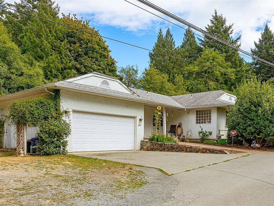 Over an Acre in Langford! This unique and private rancher is nestled on a spacious lot offering over an acre of land — complete with RV parking and plenty of room for all your toys. Inside, you'll find a bright open-concept kitchen wth eating area, seperate dining room, a generous primary bedroom with a walk-in closet and ensuite, and a spacious second bedroom with its own full bath. Enjoy the convenience of in-floor heating, a sunroom for year-round relaxation, and a double garage with ample additional parking. Sewer is at the lot line. The easy-care lot makes maintenance a breeze, and the location can't be beat — just minutes to all amenities with quick access to the highway. A rare find in Langford — don't miss it!
