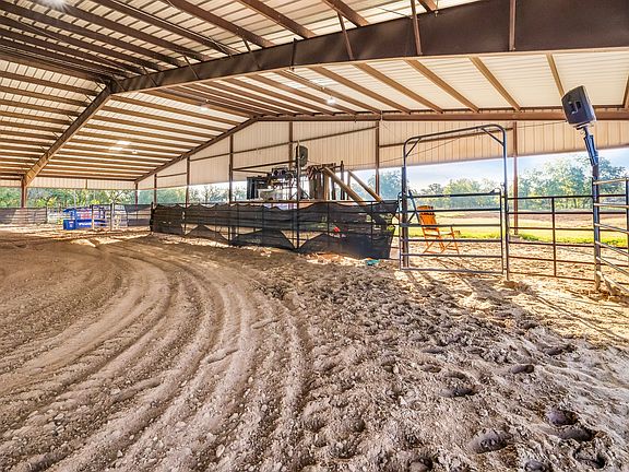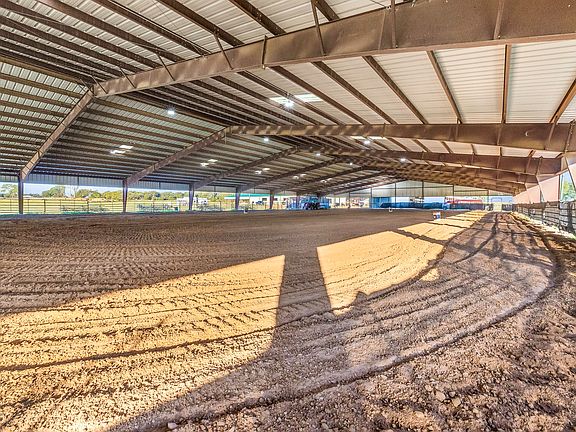 At the heart of the property is a 175' x 250' covered arena, ideal for barrel racing, team roping, calf roping, and more — fully equipped with a calf lane, catch pen, and chute for smooth practice or events. A 20-stall barn anchors the horse facilities, featuring two tack and feed rooms — one complete with a rotating saddle wall, the other plumbed and ready to convert into a cozy apartment. There's even room to expand with additional stalls or add turnouts.