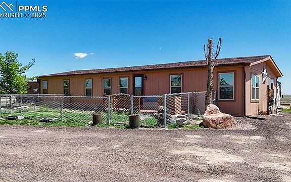 Discover your own slice of Colorado on 6.2 acres with Front Range and Pikes Peak views. This 3-bedroom, 2-bath home (with a half-bath rough-in) offers hardwood floors, tile entry and baths, a new water heater, central AC, and a working hot tub. The energy-efficient 200-amp panel and cistern-rated washer/dryer support sustainable living. The property is ready for horses, hobby farming, and self-sufficient living with three 50-amp RV hookups, a gray-water drain, shop buildings with welding power, loafing and tack sheds, barbless and hotwire fencing, and an outlet for heating animal water tanks. Enjoy a leased propane tank for heating, a cistern fill service, septic system, rainwater catch tanks, and an asphalt driveway. Perfect for those seeking room to breathe, work, and play in a peaceful rural setting.