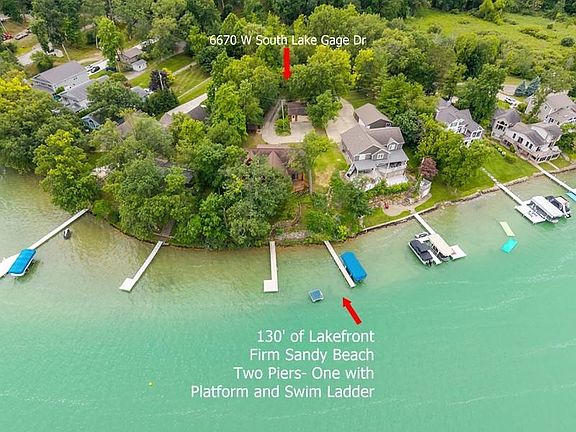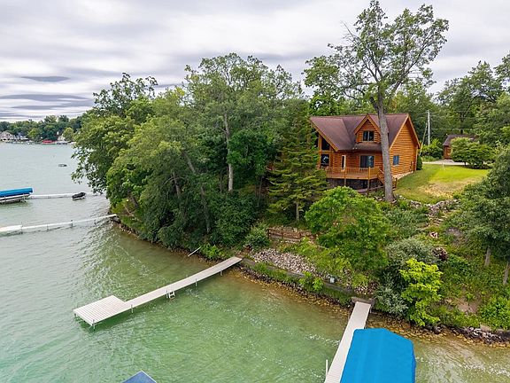 Experience lakefront living at its finest in this breathtaking 5-bedroom, 3.5-bath log home boasting 4,812 sq ft of rustic elegance and modern comfort. Nestled along 130 feet of pristine shoreline, this property offers a private beach, two piers, and panoramic water views from every room. Grand open-concept living/dining/kitchen with soaring cathedral log beam ceilings. Wall of windows framing spectacular lake vistas and flooding the space with natural light. Cozy gas log fireplace and seamless access to a wraparound deck—perfect for entertaining. Kitchen with abundant cabinetry and full appliance package. Main-level primary suite with walk-in closet, jetted tub/shower, double vanity, and deck access. Convenient half bath with laundry closet. Upstairs features two spacious bedrooms (each with dual closets), a full bath, and a versatile loft/bunk area. Walk-out lower level includes a lakeside family room with dry bar/kitchenette, two spacious guest bedrooms with dual closets, full bathroom, and mechanical room. Additional Amenities: Hardwood flooring throughout the main living area and above grade bedrooms. Tile in the bathrooms and kitchen. Carpet in the lower level. Heated concrete driveway for year-round convenience. Generac whole-house generator. Detached 2+ car garage and garden shed. Whether you're seeking a year-round residence or a luxurious lake retreat, this property delivers unmatched tranquility, space, and style. Make Lake Gage your everyday escape.