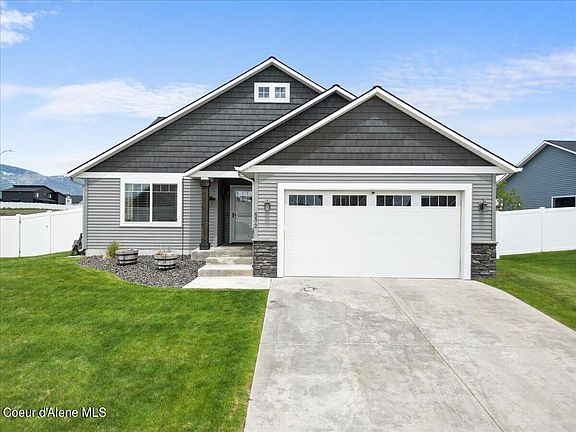 Built in 2020, this well maintained home shows pride of ownership with custom features throughout! The main living space is open concept with a cozy gas fireplace with stone surround tile. The kitchen is a dream with quartz counters, stainless steel appliances, a large island with a breakfast bar and an undermount apron sink! You'll find thoughtfully designed feature walls and carefully selected lighting fixtures elevate the style of this home from builder grade to custom made! Enjoy the outdoors year-round on the expansive covered back patio in the privacy of the fully fenced backyard with additionally fenced off area for storage, animals, or gardening! The garage is set up with its own heating thermostat! All of this is conveniently located in a beautiful neighborhood close to amazing North Idaho recreational opportunities including Silverwood Theme Park, hiking Rathdrum Mountain, or swimming in one of the many surrounding lakes!