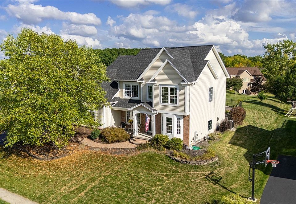 Welcome to the desirable Camden Hills neighborhood in Victor Schools! This 5-bedroom, 3.5-bath home offers almost 4,000 SqFt of living space on a half-acre lot with a 3 car garage! Step outside to your private retreat featuring a sparkling inground pool with custom lighting, paver patio, and a covered porch with heat and built-in BBQ, the perfect spot for entertaining and relaxing year-round. Inside, a dramatic two-story living room with a wall of windows, gas fireplace and built-ins sets the tone for the open-concept and luxurious design. The gourmet kitchen boasts granite counters, tile backsplash, center island, breakfast bar & a brand-new custom pantry, flowing seamlessly into the breakfast room and formal dining with dry bar, open shelving & wine fridge. The main floor also offers a mudroom, half bath, and versatile office/playroom. Upstairs, the primary suite includes a walk-in closet and spa-like bath with Jacuzzi tub. Plus three additional bedrooms and an updated full bath with new flooring, vanity & fixtures. The fully finished lower level adds even more included square footage with a family room, multipurpose room, 5th bedroom, and 3rd full bath. A 3-car garage with epoxy floor and storage, a radon system and the brand-new tear-off roof (’24) complete this exceptional property! Negotiations begin Tuesday, September 30th at 3:00pm.