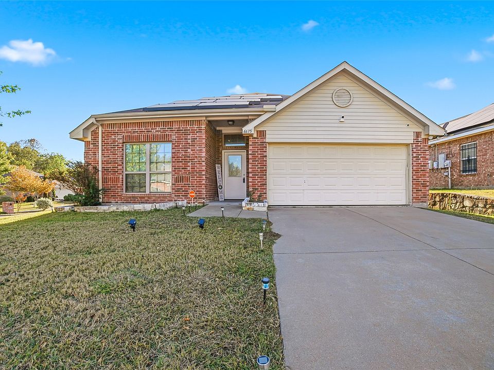 Welcome to 6675 Cool Morn Drive, a charming single-story home nestled on a landscaped corner lot in the desirable Cedar Creek Ranch community. This beautifully maintained 3-bedroom, 2-bath residence offers an inviting open-concept layout with stylish updates throughout. The spacious living area flows seamlessly into the eat-in kitchen, featuring a large island, breakfast bar, walk-in pantry, and plenty of cabinet space. The primary suite provides a peaceful retreat with a generous ensuite bathroom complete with dual sinks, a garden tub, and a separate shower. Enjoy the outdoors in your private fenced backyard with a covered patio—perfect for relaxing or entertaining. Home features solar panels on the front and side, a new tankless water heater, and a brand-new backyard wood fence. Additional highlights include new luxury vinyl plank flooring and a two-car garage. Conveniently located near parks, schools, and major highways, this move-in-ready home combines comfort, style, and energy efficiency in one perfect package. Schedule a showing today!!