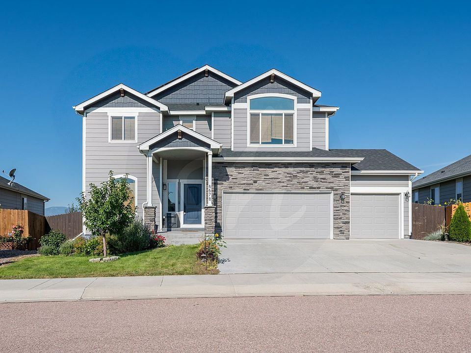 This exceptional home welcomes you with a formal dining room and butler's pantry. Open floor plan flows into a spacious kitchen with large island and bright living room featuring expansive windows and loft above. Main floor is complete with a convenient half bath. The upper level boasts a luxurious primary suite with 5-piece bathroom, three additional bedrooms, full bath and convenient laundry room. The finished basement offers a spacious bonus/rec room plus bedroom and full bathroom. The fully fenced backyard provides breathtaking mountain views and privacy. Complete with solar panels, 3-car garage and central air conditioning this home offers several amenities. With easy access to Fort Carson, Peterson Space Force Base, Highway 25, Powers Corridor, Parks and Schools.