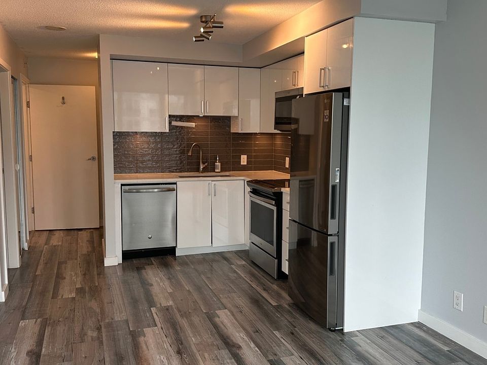 Laminate flooringOver-height ceilingsFloor-to-ceiling windowsPrivate balconyContemporary kitchenCustom cabinetryQuartz countertops
