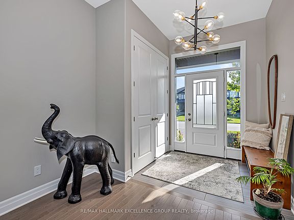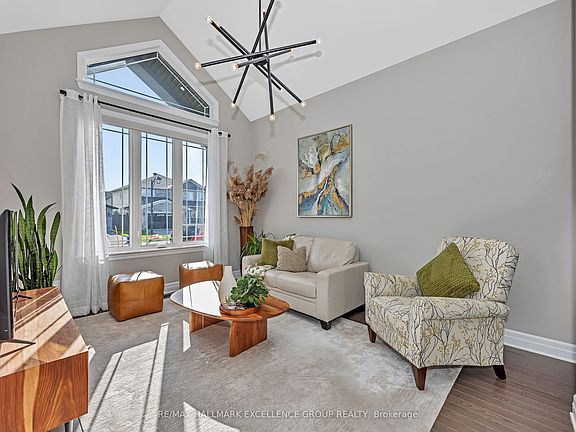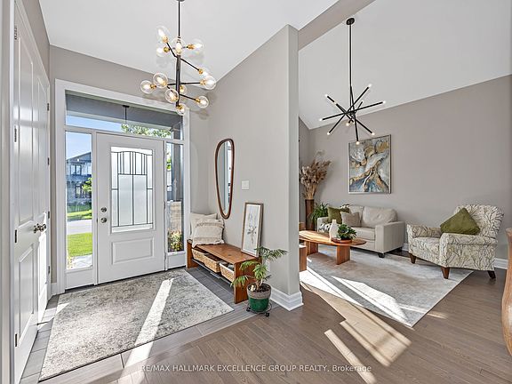 Welcome to this stunning 3+1 bedroom bungalow built by Woodfield, nestled in a quiet and newer area of Morris Village, in Rockland. This thoughtfully designed home features hardwood & ceramic flooring throughout the main level, soaring cathedral ceilings, and a beautiful two-sided gas fireplace separating the spacious living and dining rooms. The bright, modern kitchen opens to the cozy family room and includes a large island with quartz countertops which is ideal for entertaining. A second gas fireplace adds warmth & charm to this inviting space. The primary bedroom is a true retreat, complete with a luxurious 5-piece ensuite bath and walk-in closet. Downstairs, the fully finished basement offers even more living space with a 4th bedroom, large recreation room, home gym, kitchenette/wet bar area, full bath, utility room, and ample storage. Enjoy outdoor living in the fully fenced backyard featuring low-maintenance tiered composite decks, landscaped flower beds, and pipe ready irrigation. The double garage is insulated and perfect for year-round use. Ideally located within walking distance to parks and an exterior skating rink, and just a 5-minute drive to the local golf course, shops, restaurants, and other amenities. This bright, welcoming home offers exceptional comfort, space, and style... perfect for families and entertainers alike! 24 Hours Irrevocable on all offers.