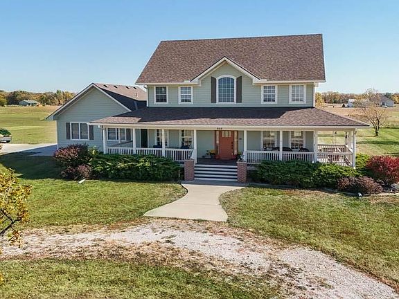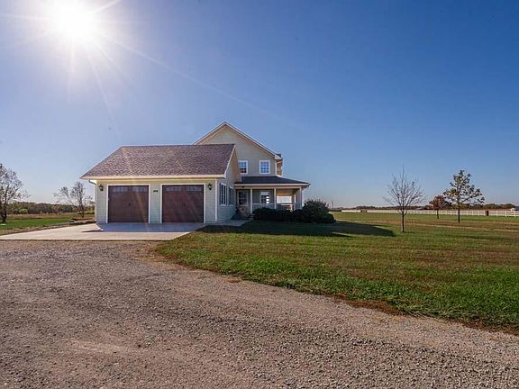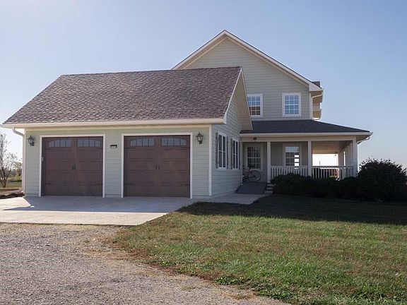 Beautiful Country home on 5 acres. Minutes from Lawrence or Baldwin, just off paved roads. Built in 2007, this 2500+ square foot home features 3 spacious bedrooms, 2.5 baths, an oversized garage, new roof, new gutters, new garage doors, freshly painted interior walls, kitchen cabinets, and exterior! Enjoy the large primary suite with tons of windows for natural light. Wake up each morning to amazing views! Relax on the porch swing and enjoy unobstructed views of the breathtaking sunsets, or go on a stroll along a walking path carved out through the prairie grass on the back of your property. This home has plenty of room for expansion with a large unfinished basement. This custom built home boasts stainless steel appliances, beautiful wood floors, granite countertops, custom tile backsplash with inlays, walk-in primary shower, low maintenance fiber cement siding, and a gas fireplace! This home is the perfect place for entertaining.