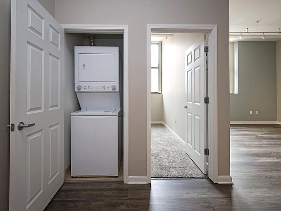 FEATURED AMENITIES. Expansive windows that open allow for ample natural light and fresh air. Stainless steel appliances include refrigerator, electric stove, dishwasher, microwave and double sink with garbage disposal. Large open floor plan with island in the kitchen (most suites). Maple-finished custom cabinets. Granite countertops in the kitchen and bathrooms. Porcelain tile in the kitchen and bathrooms. Full capacity stackable washer and dryer included. Neutral carpeting and tan paint with white trim throughout. Central heating/air conditioning.