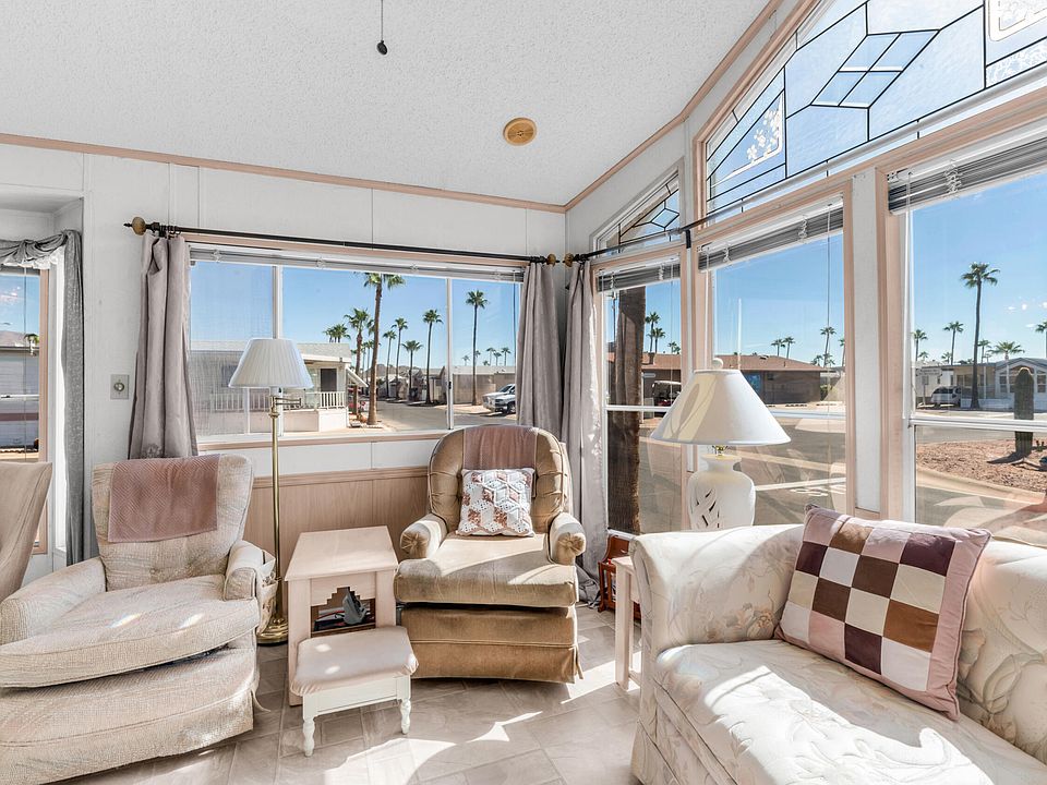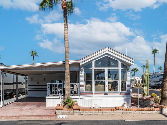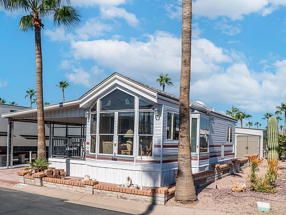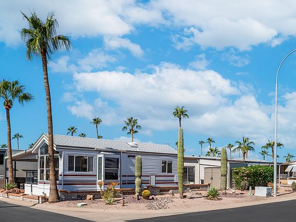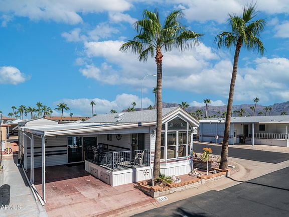 Get ready to fall in love with this corner lot beauty where the Superstition Mountain views are so good you'll feel like they were put there just for you! Big bright windows make it feel like you're outdoors even when you're inside, & two skylights flood the space with that gorgeous Arizona sunshine. The roof was updated about five years ago, so that big-ticket item is already checked off your list. The oversized Arizona room adds the perfect bonus space for relaxing, hosting guests, or just pretending you're on vacation year round. Inside you'll find a full size washer & dryer to make laundry a breeze, vaulted ceilings, & a roomy kitchen with plenty of counter space for your favorite snacks or your next big recipe experiment. The bathroom even has a corner tub shower combo with a little extra elbow room because, let's be honest, space is important. Step outside to enjoy both a spacious front deck & back patio with pavers, ideal for morning coffee, afternoon sunshine, or evening chats with neighbors. With no one to your east, you'll always have clear mountain views & a bigger than it looks yard that feels extra open. Plus, right across the street is guest parking, additional laundry facilities, showers & bathrooms, pretty much everything you could ask for when friends come to visit. Add in two water heaters (no cold showers here!) & a larger parking area thanks to the grandfathered setbacks, & you've got yourself a home that's not only functional but full of personality. Bright, open, comfortable & full of good vibes this is the Arizona lifestyle you've been waiting for!