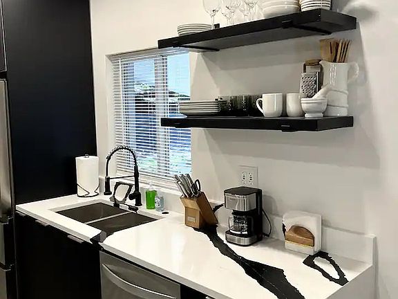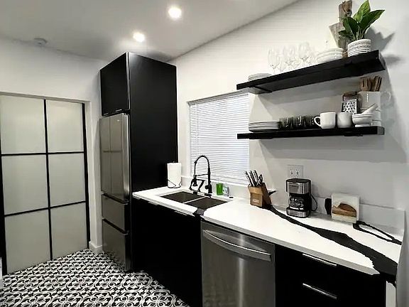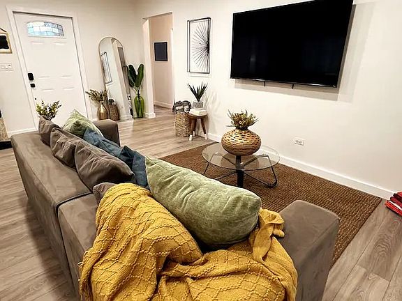 This renovated, stylish, and family-friendly house is among the peaceful oak trees in a quiet neighborhood.
