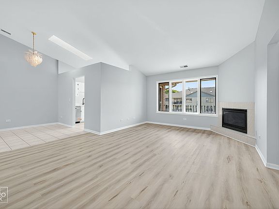 Fully updated (2025) 2 bedrooms and 2 full bathrooms with approximately 1200 square feet of living space. Move in ready. Clean, elegant feel throughout. Neutral colors, white trims and doors, brand new, modern light fixtures, fire place in living room. New laminate flooring in living room & bedrooms, new/updated bathrooms (featuring 1 shower and 1 bathtub). Fully updated kitchen with all brand new appliances (with 2 year warranty). This unit has washer & dryer. Balcony overlooking subdivision gazebo- perfect for your quiet morning coffee time or afternoon grilling. 1 car garage. Great, quiet neighborhood near shopping, restaurants, expressway I-80. Good school districts.