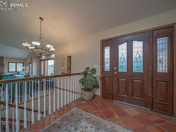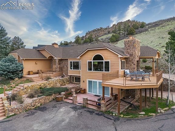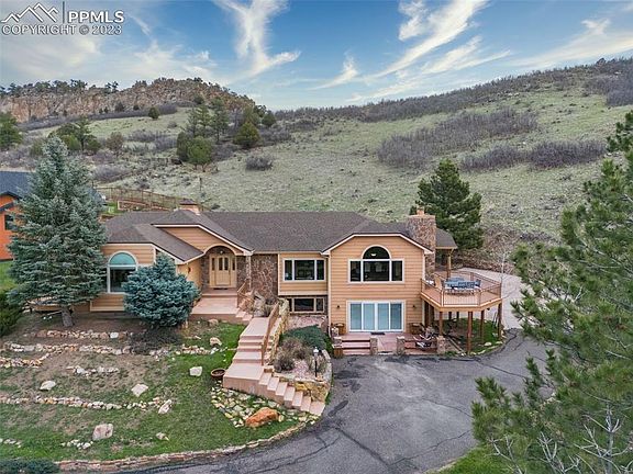 Now THIS is a VIEW! * Incredible Panoramic Mountain Views including Indian Head Mountain! Right across the street from "Sentinel Rock" and the Championship Rated 18-Hole Perry Park Golf Course. Backs to Open-Space as well * Fully-Custom RANCH-STYLE Home with Finished Walkout Basement. Brand New Asphalt Driveway paved on 6/23/23 * Spacious main floor master-suite with adjoining 6-piece master bath includes jetted spa tub & bidet. The main floor even includes a 2nd Bedroom with it's own private full bathroom. Enjoy extensive wood flooring, a chef's kitchen with slab granite counters, natural cherry-wood cabinets, stainless steel appliances, pantry AND a Butler's Pantry * Light and bright with inspiring scenery from every window. Vaults and skylights. Take full advantage of enjoying your Outdoor Colorado Lifestyle with access to a massive main-floor Trex Deck (partially covered) with built-in gas grill. Backyard concrete and flagstone patios as well. PLUS a front walkout concrete patio AND a Private Master Trex Deck. Enjoy daily visits from friendly neighborhood deer and a huge variety of birds and Hummingbirds * The Walkout Basement offers plenty of room for guests and entertainment with a huge a Game Room, Study/Den with built-in cabinets, a Separate Family Room with a workout area (Great Man-Cave area), Bedroom #3 and a HUGE Laundry Room (currently used as Bedroom #4) * Professionally landscaped, concrete walk-ways & stone walls. Colorado mountain living at its finest with an easy commute to either Denver or Colorado Springs. NO HOA. Public paved roads * The driving range is a short walk away and both social and full golf memberships are available at the Perry Park Country Club (rated by Avid Golf as Colorado's Best Value Private Golf Course). Bear Dance Golf Course (Colorado's PGA Headquarters) is a short drive away as well. LOTS of hiking and biking opportunities * A PREMIUM LOCATION in popular Perry Park. Can close FAST! Come make this YOUR dream home!