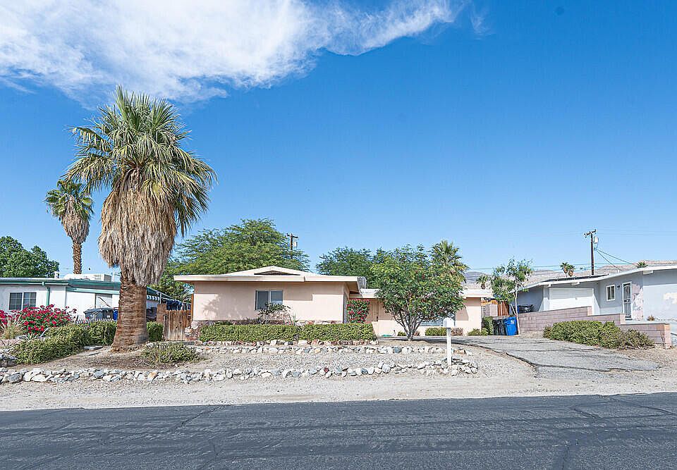Att:Investors, Landlords, 2nd home, Vacation owner, aBnB, Great ROi! or fluff n flip.*3/2 apprx 1,400 sf + 400sf 2car-Gar, blockwalls, mature-shady landscape. Large Pool size lot.*Laundry room appliances included, large covered patio.**Well Built midcentury Home Cleaned&Sanitized. Blank canvas awaits your modern Touch & Tlc.As-Is, (not falling apart - simply deferred maintenance). Leaky toilet, drive- way need repair, & shower valves, 1-side of window frame coming apart,where wall a/c u it installed - left unfinished. . {Buyers to do due diligence inspection- per CAR winform Agreement).Spacious floorplan seperation of bedrooms.Lots of custom Hardwood Cabinets - Pantry, vanity, closets, storage, coat-closet, hall closet.Awesome Mt.views!*Ideal location - close to shopping, transportation, steps to school, walk uptown, Hot mineral Spa's Water Surf Parks, close to hiking trails,biking. Half hour to Palm Springs, El Paseo, World-class venues; Coachella Fest, Stage Coach, PGA-Golf Tennis, Pickleball, Entertainment, Casinos; mma, boxing, hockey, concerts. Not far Mountain Resorts - Skiing, Lakes, The River - water sports -Approx.100 miles -drive to Beaches, San Diego, Lax, Amusement Theme Parks, Disney ect. Your new home - solid midcentury built to last - 'As-Is' bargain basement price {you will find nowhere} @ approx.$215. per-sq.ft. plus a little fixin n fluffin and cosmetic repair you'll be ready to move-in for life - with a clean slate, ready for personal touches & desires, 'Your' design on your blank canvas - you choose your colors & flooring. Great construction Better than new @ half the price - lotsa land - spacious roomy for Adu too.Nce neighbors-hood watch peaceful, not quite - neighbor has rooster.