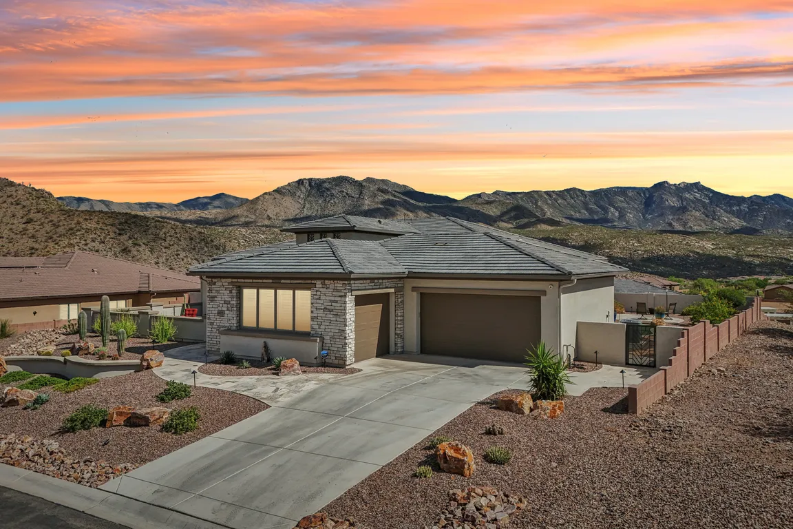 - Features: Borders Common Area, Elevated Lot, North/South Exposure, Landscape - Front: Desert Plantings, Flower Beds, Low Care, Shrubs, Sprinkler/Drip, Landscape - Rear: Decorative Gravel, Desert Plantings, Low Care, Shrubs, Sprinkler/Drip, Vegetable Garden