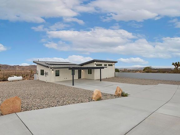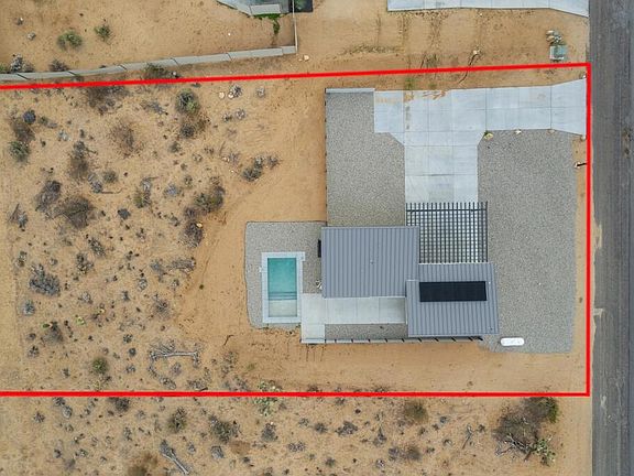 Discover the pinnacle of desert modern living in this stunning NEW Construction POOL HOME with OWNED SOLAR, where every detail has been thoughtfully curated for style and efficiency on a premier 18,500 square foot hillside lot. The home captures unparalleled serenity with breathtaking mountain views that serve as the backdrop to every room. Enjoy your private 20'x10' PebbleTec pool with designer tile and high-end Pentair equipment, which flows seamlessly into the stunning desert landscape. The property features sleek metal fencing, and the immense 18,500 sq ft lot extends well past the pool area, providing abundant space for the new owner to seamlessly continue their design vision and create a truly custom, private desert oasis. The sophisticated, open-concept interior is anchored by a designer kitchen, showcasing rich dark wood cabinetry, quartz countertops, a generous island, LG appliances, and sleek pendant lighting. Dramatic soaring ceilings and clerestory windows ensure the interiors are continuously flooded with natural light, blurring the lines between indoor luxury and the high desert landscape. Beyond the aesthetic, enjoy powerful utility features, including owned solar, three efficient Mitsubishi mini-splits, EV ready pre-plumbing, and hybrid gas/electric washer/dryer hookups. The Primary Suite delivers a sleek walk-in shower enveloped in floor-to-ceiling large-format tile, mirrored by the Guest Bath's oversized soaking tub, also finished in luxurious floor-to-ceiling tiling. Complete with an extended driveway (garage potential) and paved road access, this retreat is ideally situated a few miles from Joshua Tree National Park and minutes to all the amenities of downtown Joshua Tree's shopping and dining.