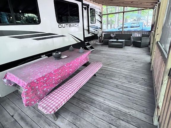 2022 Keystone Outback 340BH – Luxury Family Retreat ? Step into comfort and style with this spacious 38-foot 2022 Keystone Outback 340BH. It has 3 slides and a 50 amp. service. Featuring two private bedrooms, a full bathroom, and an open-concept living room, dining area, and modern kitchen with center island, this unit is designed for both relaxation and entertaining. Upgraded plank flooring, a stylish kitchen, and a bathroom with recessed lighting add a touch of modern elegance throughout. Outside, enjoy the expansive 12’ x 30’ screened-in Florida room, perfect for year-round gatherings and extra living space. Open sky lights also. It has a tankless hot water heater and a solar roof panel. This Keystone Outback combines residential-style upgrades with the convenience of RV living, making it an ideal getaway for family and friends. Fire pit and pavers around the camper, a Hideaway TV and an outside kitchen on the porch. Golf cart is for sale also.