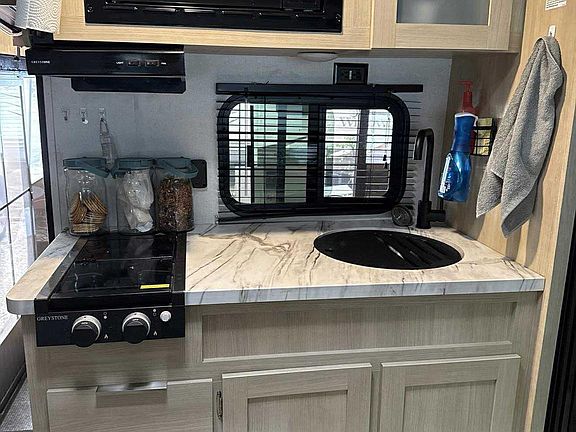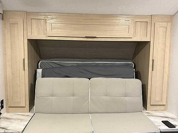 Convenient bathroomLow-maintenance stone landscapingPatio furnitureOutdoor kitchenDouble bunk roomSpacious slide-outRear storage sheds