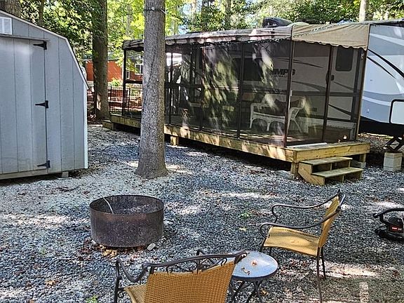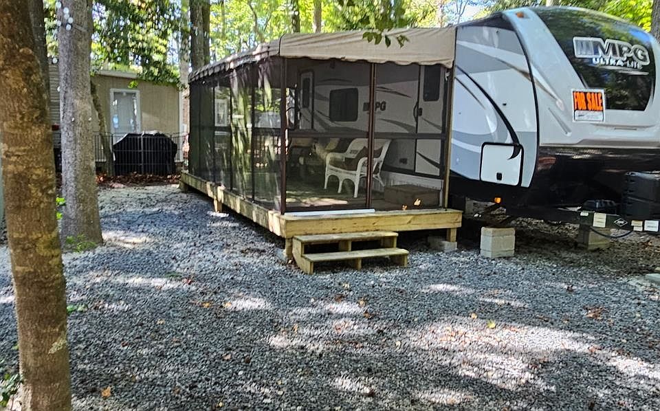 Beautiful 2018 30’ MPG Lightweight Camper with Screened Porch. Enjoy comfortable and stylish camping in this 2018 30-foot MPG lightweight camper featuring an open-concept design with a spacious kitchen, dining area, and living room. The interior is finished with durable laminate flooring and includes a full bathroom and a private master bedroom. A large slide-out provides extra living space for added comfort. Step outside to a 10’ x 20’ screened-in porch, perfect for relaxing or entertaining. The exterior features a crushed rock driveway, cozy fire pit and grill area, a patio set space for outdoor dining, and a convenient storage shed. This turnkey setup combines comfort, functionality, and outdoor enjoyment—ready for your next getaway!