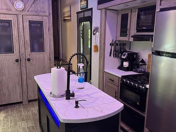 2021 Forest River Cherokee Arctic Wolf Fifth Wheel – Premier Lakefront Site at Lake Laurie Campground Experience luxury camping at its finest with this stunning 2021 Forest River Cherokee Arctic Wolf fifth wheel, perfectly situated on a premier lakefront site at Lake Laurie Campground. This spacious, open-concept camper features a beautifully designed living room, dining area, and kitchen with a center island, ideal for entertaining or relaxing in comfort. Inside, you’ll find many new appliances, a cozy electric fireplace, a private master bedroom, and a full bathroom for convenience. The upstairs loft bedroom includes its own half bath, providing ample space and privacy for family or guests. Step outside to enjoy the expansive deck overlooking the lake—perfect for morning coffee or evening sunsets. The outdoor area includes a fully equipped kitchen, fire pit, and plenty of storage, making this the ultimate lakefront getaway. Enjoy your own slice of paradise at one of Lake Laurie’s most sought-after sites—where comfort, nature, and resort-style living meet. This is a seasonal site from April 1 to November 1, 2025 Park fees for $8030. $750 deposit for 2026 as been paid.