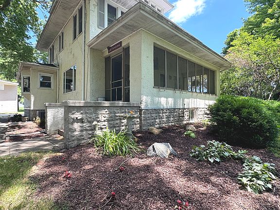 This 2 Story Farmhouse, nestled in the shade of mature trees on this 5 Acres, exudes rustic charm.  Stepping inside, you'll be greeted by the warmth of original woodwork and rich hardwood floors, creating an inviting atmosphere.  The spacious country Kitchen offers ample cabinet and counter space, plus space for a table with a view of the outdoors. The Kitchens leads into the large Formal Dining room and seamlessly into the Living Room through a set of graceful French doors.  Morning and evening, unwind on the large enclosed front porch.  Beautifully updated 2nd floor Bath features a standalone soaker tub, double vanity, tiled shower w/niche and glass doors. Generous size Bedrooms w/rustic closet barn doors.  Replacement Thermal pane windows are an added bonus.  Updated main floor 1/2 Bath.  30x40 Block Building with 16' wide - 12' high door and 18' ceilings with water. Detached 2 Car Garage, Corn Crib and livestock building approx. 15x25, and electric is run to all buildings. The 5 Acre lot provides ample space for gardening, outdoor activities, and perhaps some farming endeavors - approx. 1 Acre is currently farmed.  This property is a serene retreat from the hustle and bustle of modern life!  Call for your private showing today!  Year built is estimated.