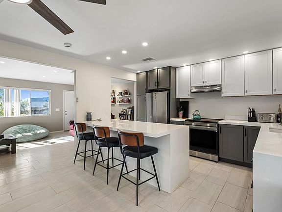 Experience desert living in this beautifully remodeled Mid-Century Modern gem at 66970 Desert View Avenue, Desert Hot Springs. This home offers over 1,100 square feet living space. The open-concept layout features brand-new wood-like tile flooring throughout, complemented by quartz countertops, recessed lighting, and updated appliances. This home is equipped with a solar system and a water softener substantial savings on your electric bills.Situated on an elevated lot, the property boasts panoramic south-facing views of Mt. San Jacinto. The home is conveniently connected to the city sewer system. With a lot size of approximately 7,841 square feet, there is ample room to add a pool or an ADU. Located just blocks from downtown Desert Hot Springs and only 15 minutes from the vibrant energy of Palm Springs, this property is perfect for a primary residence, a vacation getaway, or an investment opportunity.