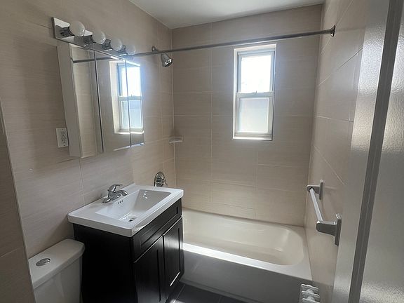 Bathroom is newly renovated in white, featuring brand new fixtures, medicine cabinet, floor tiles and ceramic wall tiles.